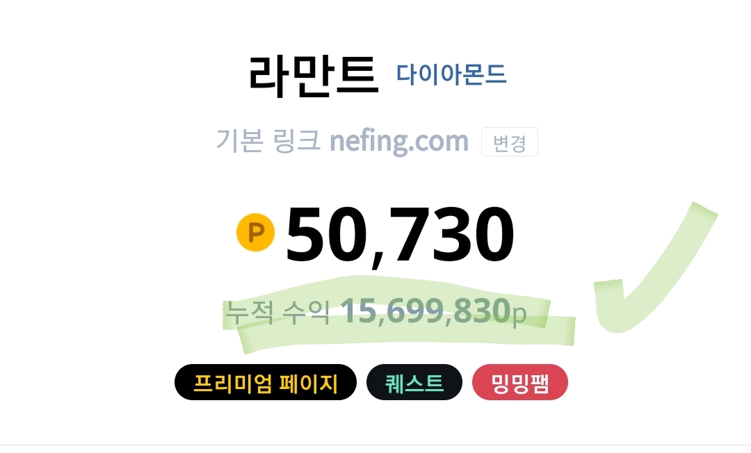 현재까지 누적 수익은 15,699,830p로